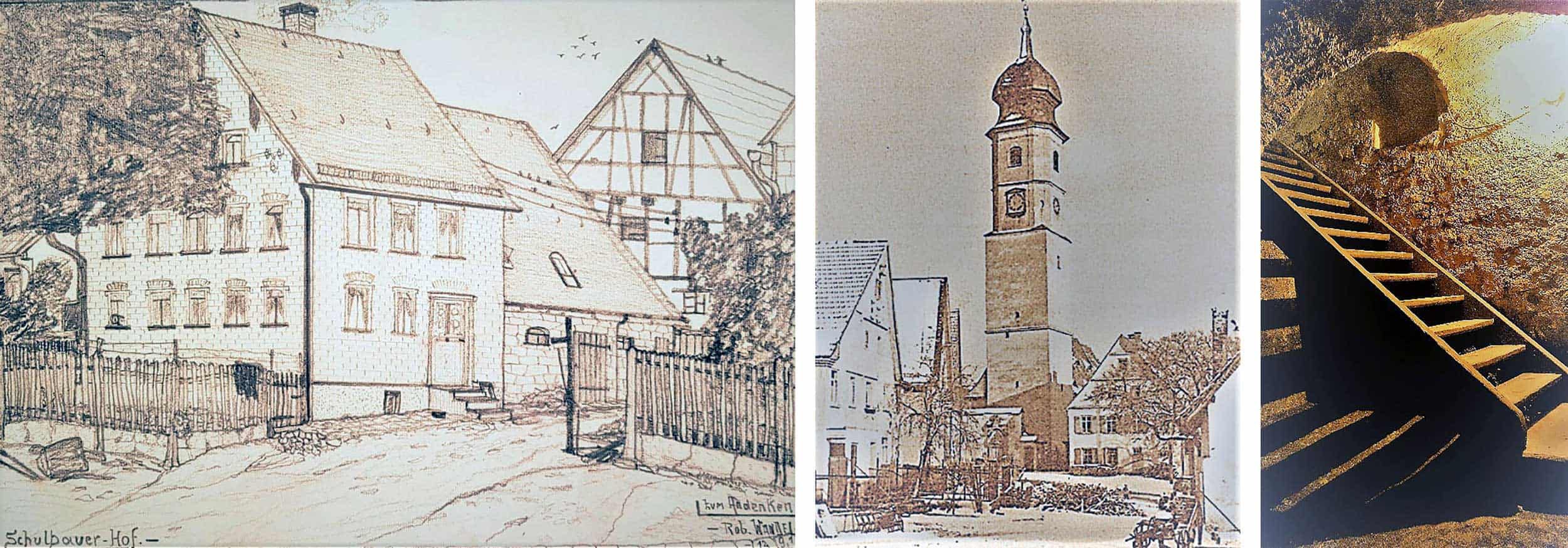 Die Hufe, in Süddeutschland Hube genannt, bezeichnet sowohl die Hofstelle, das Eigentumsrecht und die Nutzungsrechte an der Allmende, die einem Mitglied der bäuerlichen Gemeinde zustanden, als auch die von ihm bewirtschaftete Fläche. In direkter Nachbarschaft zum „Schulbauer“ befand sich seit jeher die Kirche die erstmals 1275 im Steuerregister des Bistums Konstanz erwähnt wird. Sie war ursprünglich geweiht „Unsere Jungfrau und St. Michaele“. 1512 erfolgte die Umwidmung des Patronats auf die „Heiligen Drei Könige“.