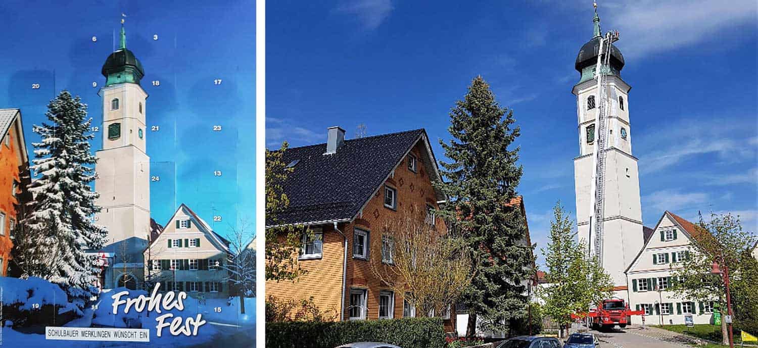 Seit 1799 ist die ev. Kirche, in der heutigen Form, mit ihrem 61 mtr. hohen Kirchturm das weithin sichtbare Wahrzeichen der Region Merklinger Alb und den vielen Besuchern des „Schulbauer“ aus nah und fern eine einprägsame Ortsmarkierung.